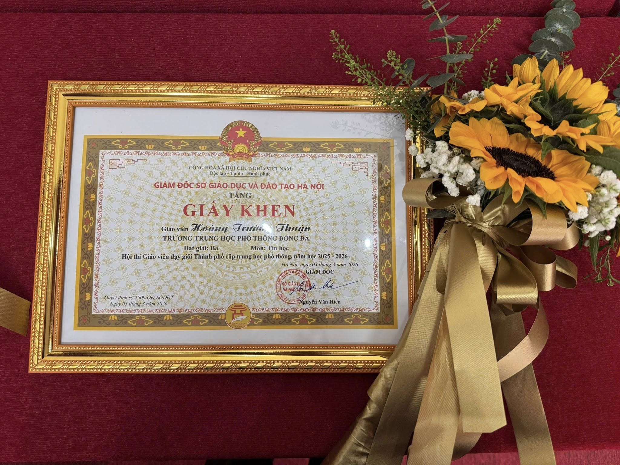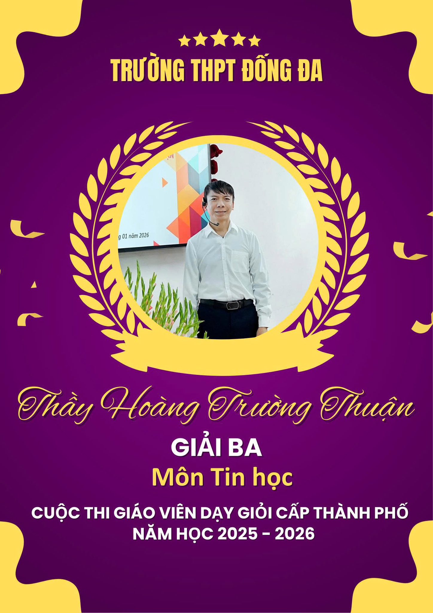 Nhà trường trân trọng chúc mừng thầy Hoàng Trường Thuận – giáo viên môn Tin học, Tổ Toán – Tin đã xuất sắc đạt Giải Ba - Cuộc thi Giáo viên dạy giỏi cấp Thành phố. Đây là thành tích đáng tự hào, ghi nhận năng lực chuyên môn vững vàng, tinh thần đổi mới sáng tạo và sự tận tâm của thầy trong sự nghiệp giáo dục.